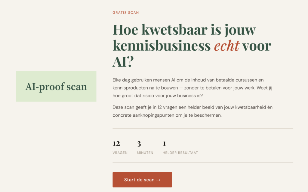 Bescherm jij je kennisbusiness al bewust? Doe de AI-kwetsbaarheidsscan. Ik ontwikkelde deze in samenwerking met AI om andere ondernemers te helpen hun content te beschermen.